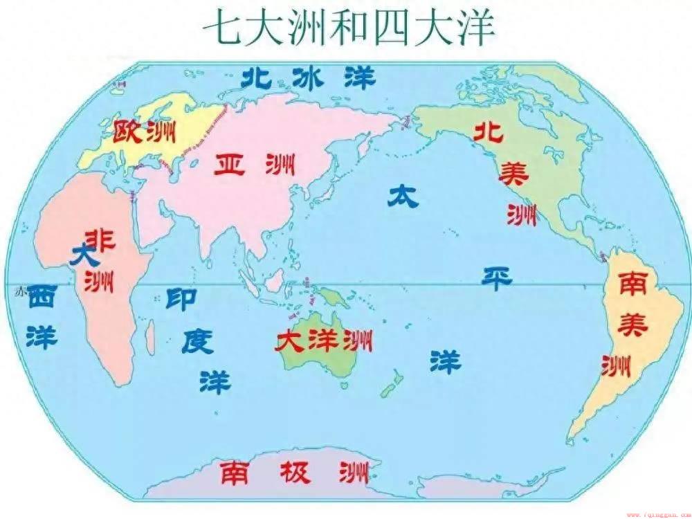 世界上有七大洲(按面积排名依次为亚洲、非洲、北美洲、南美洲、欧洲、南极洲以及大洋洲)和四大洋(太平洋、大西洋、印度洋以及北冰洋)。
