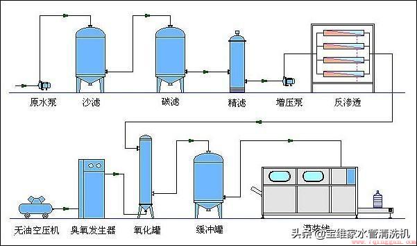 水源水→粗滤→精滤→杀菌→灌装封盖→灯检→成品↑瓶(桶)及其盖的清洗消毒。