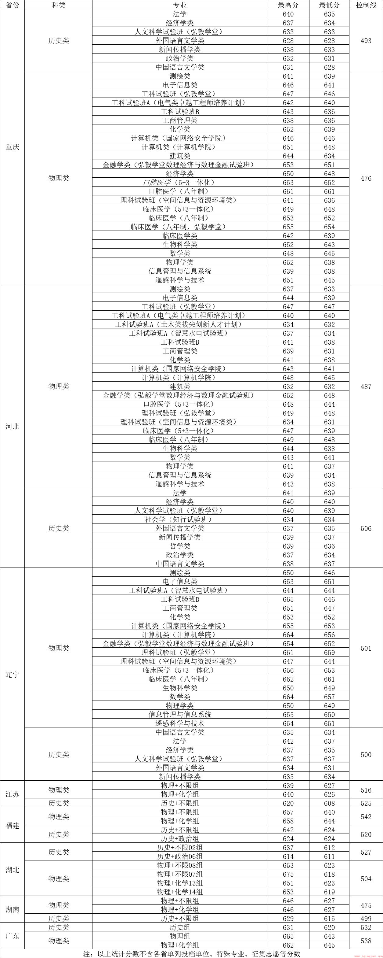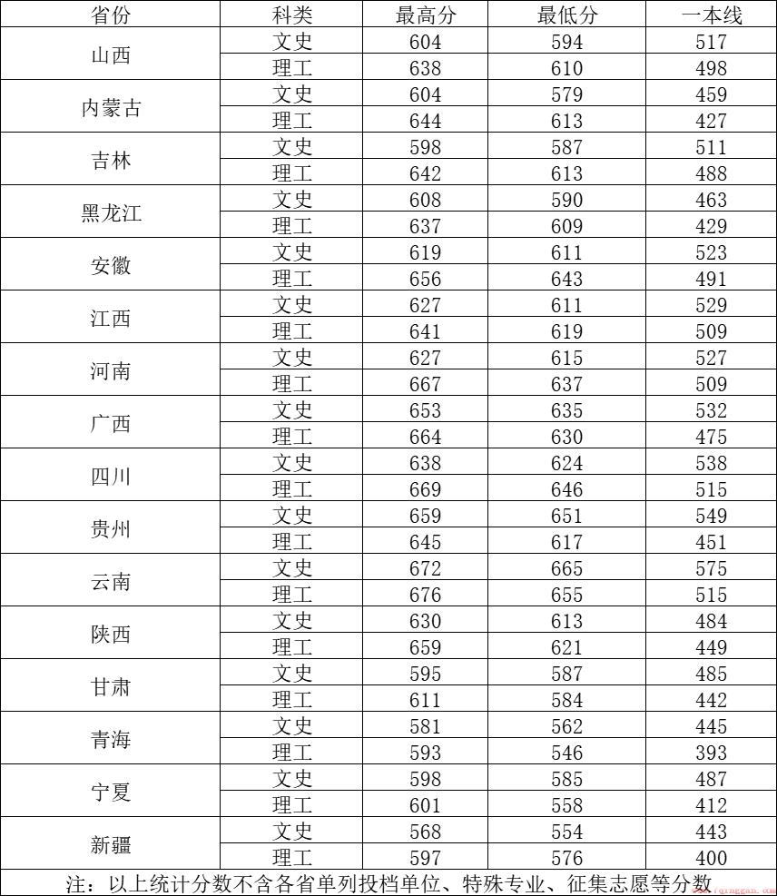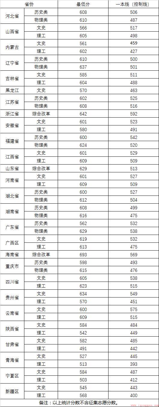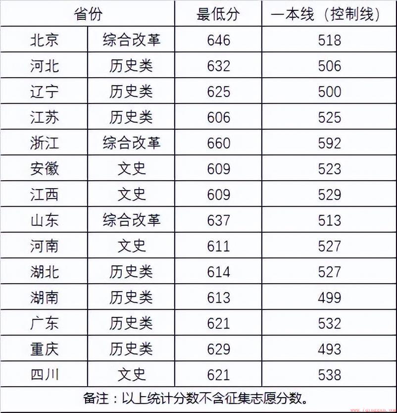 在湖北省历史类录取最低分608分,物理类最低分616分。在重庆历史类录取最低分598分,物理类最低615分。