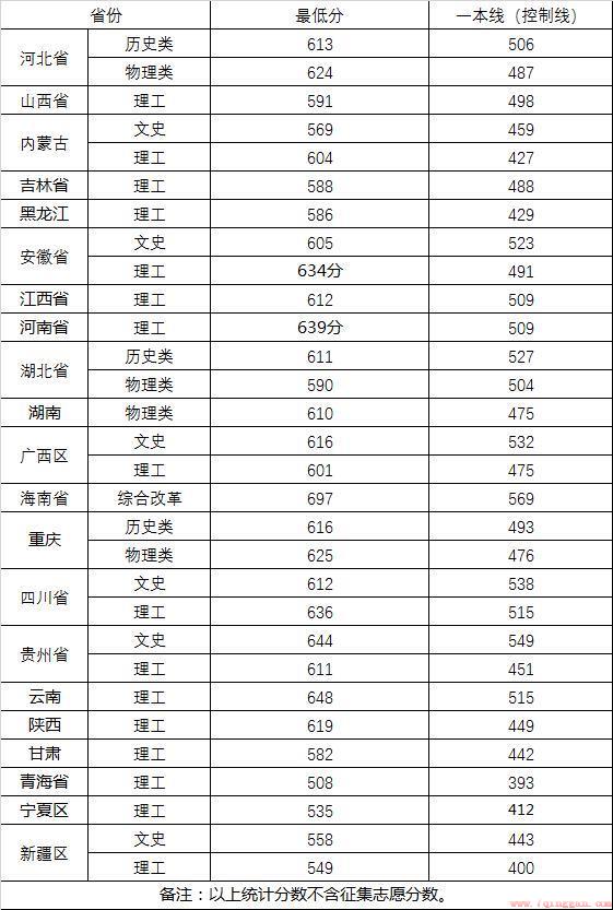 在河南省理工类录取最低分639分,在四川文史类最低分612分,物理类最低分625分。在贵州文史类最低分644分,理工类最低分611分,在云南理工类最低分648分。