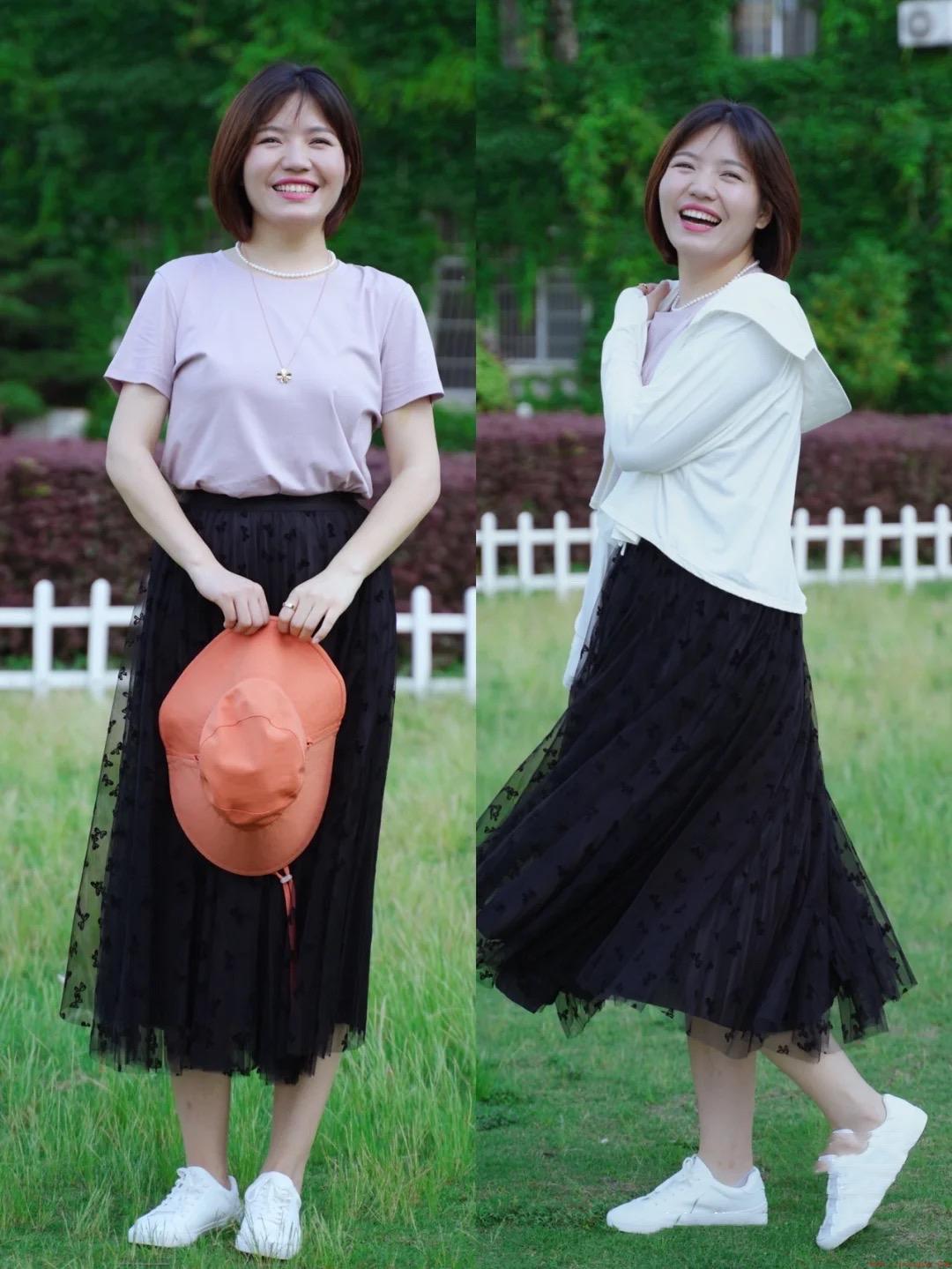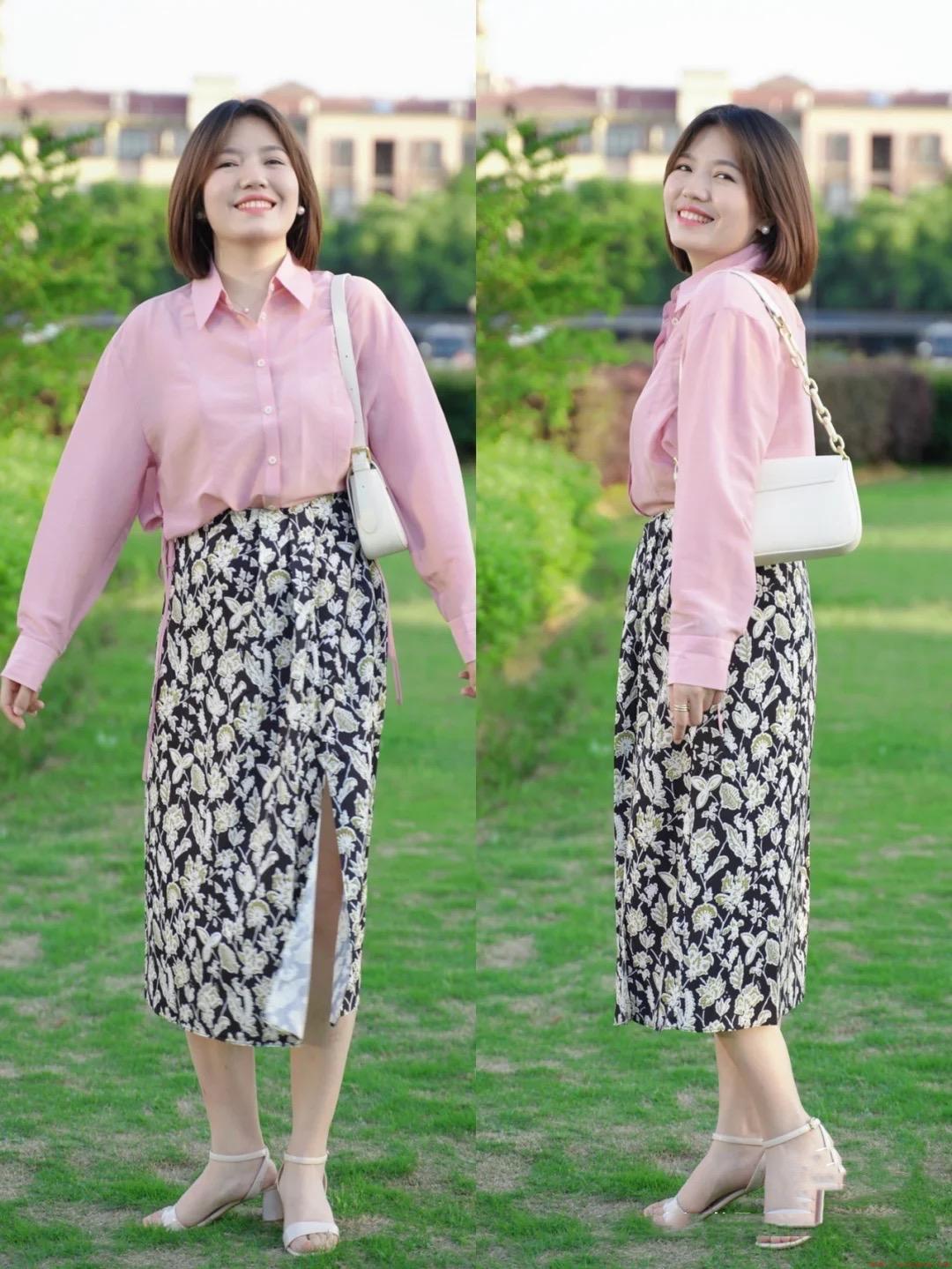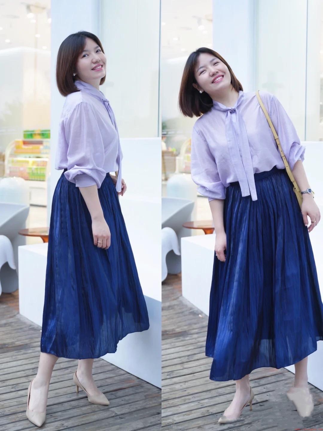因为这位博主是苹果型身材,所以属于上身比较壮硕,下身相对纤细的体型。裙装的选择有更多的可能性,除了伞裙或者A型裙摆,还可以选择具有一定宽松度的直筒半身裙,特别的轻盈飘逸。