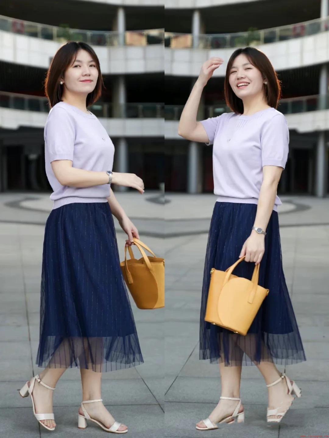 特别清爽的网纱半身裙,配上浅紫色的宽松T恤,是一种随意切慵懒的风格。简约大方,又不失女人味。搭杏色高跟鞋,气质更加出众。