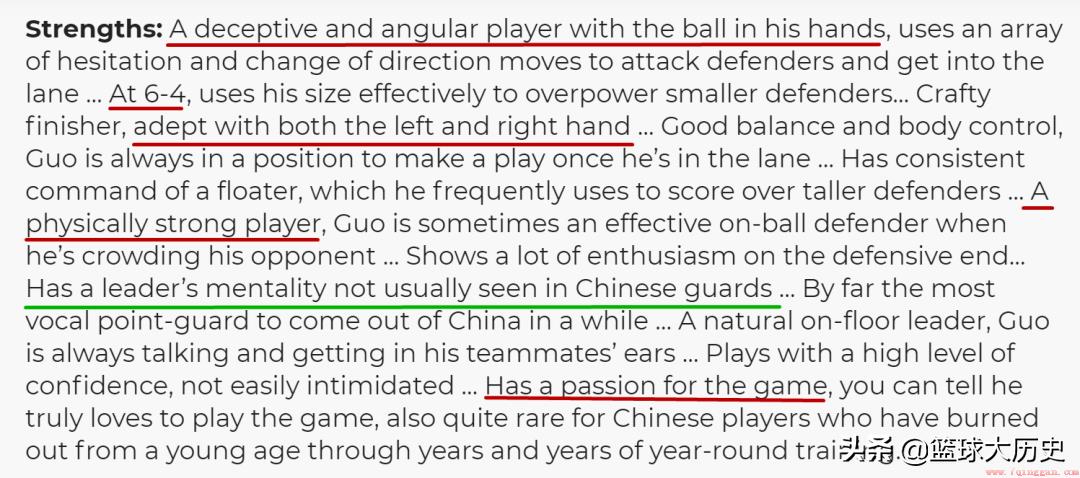 你可以看出来,当时对郭艾伦的优势分析还是比较准确的,他的控球能力、终结能力确实非常出色,身体控制能力也强,也会利用抛投得分。
