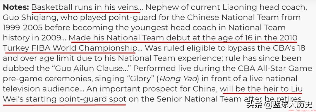 选秀报告上还特别注明了:郭艾伦身上流淌着篮球的血液,他从小就开始打篮球,是前国家队球队郭士强的侄子,16岁在土耳其世锦赛上首次亮相,并且破格被CBA录取,对于中国来说,郭艾伦可能会成为刘炜之后的下一个国家队主控。